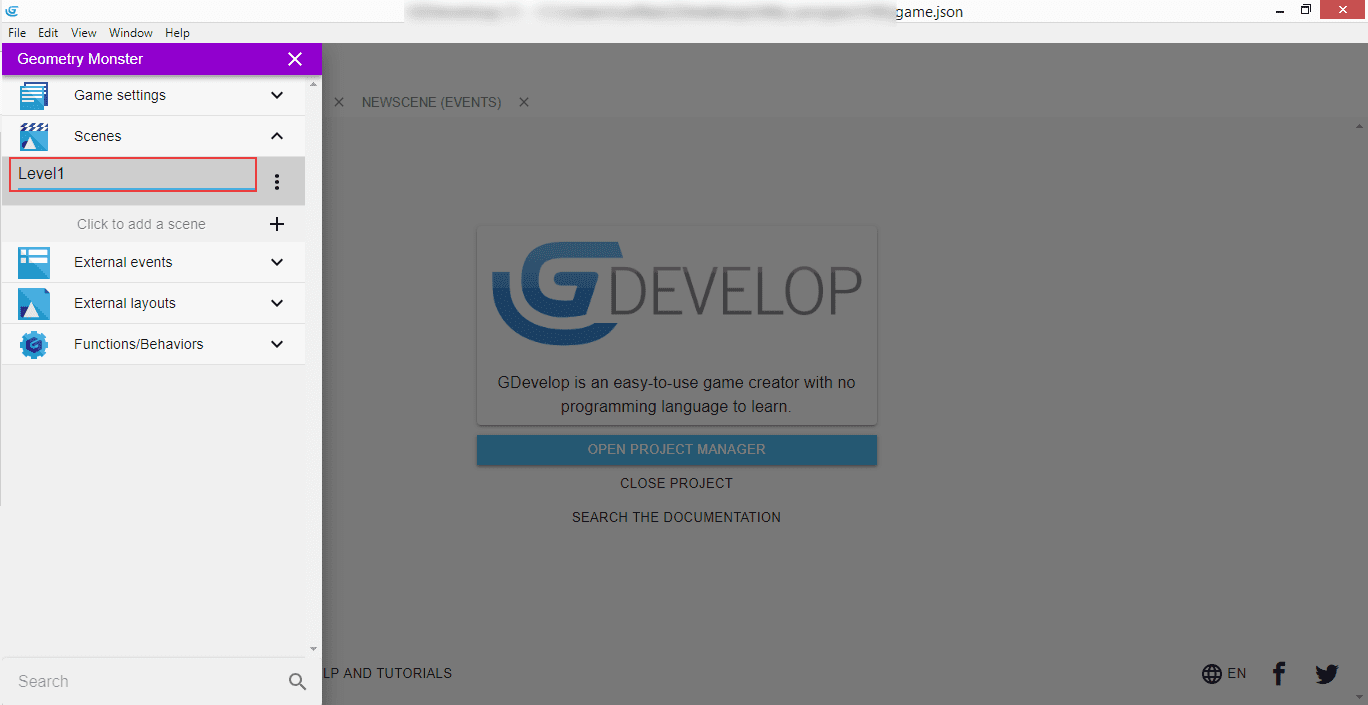Ahora que tenemos instalado el editor de GDevelop y la configuración básica está en su lugar, podemos empezar a crear. Para agregar componentes a nuestro juego, debemos comenzar con una escena - funcionará como una canasta con varios elementos y mostrándolos en la pantalla.