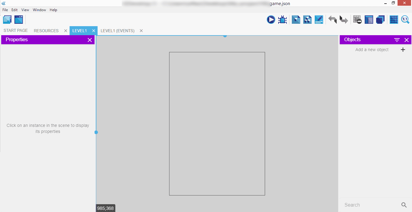 Después de crear con éxito una escena, se nos llevará directamente a ella. Observe las pestañas en la parte superior del editor que puede seleccionar: hay "Nivel1" y "Nivel1 (Eventos)" por separado. En el panel izquierdo puedes manipular las propiedades de cualquiera de las instancias seleccionadas, el contenido real de la escena es visible en el medio (con el área de juego ya en modo retrato), y una lista de "Objetos" en el panel derecho.