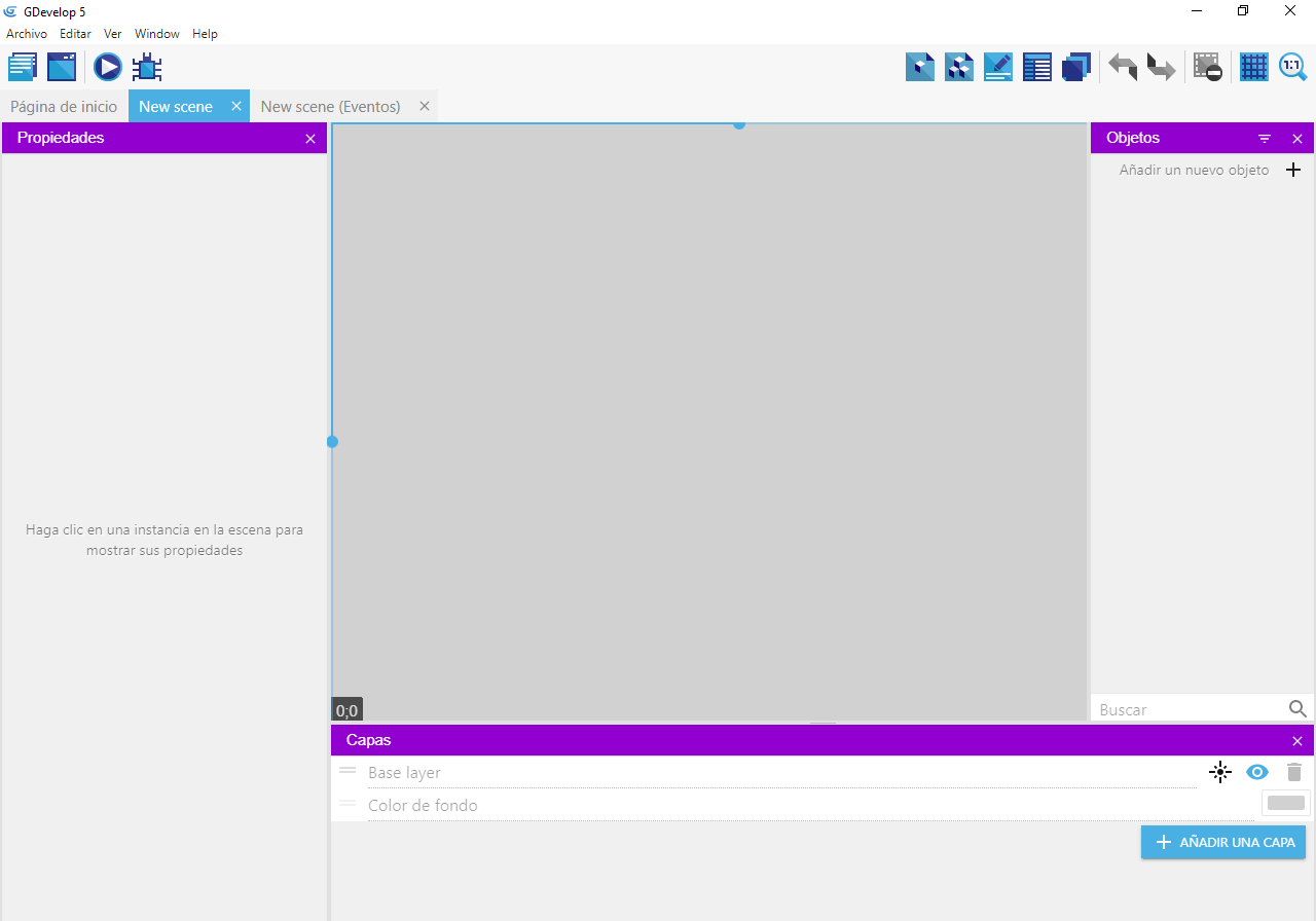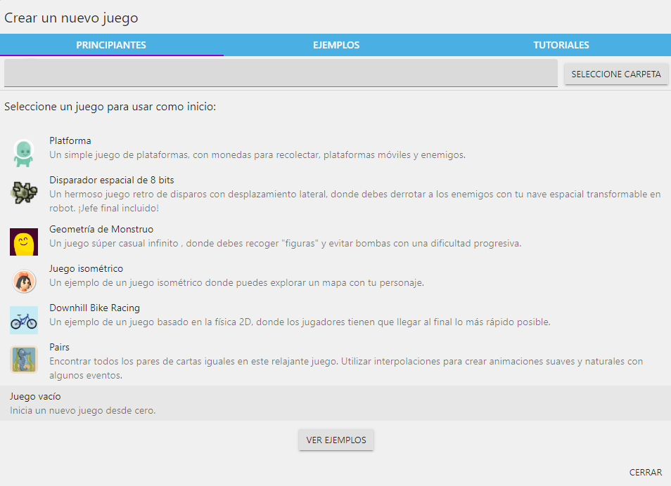 Haga clic en Crear un nuevo proyecto en la página de inicio. En la ventana, elija una carpeta para su proyecto y seleccione Proyecto Vacio o Empty Game para comenzar un juego nuevo desde cero.