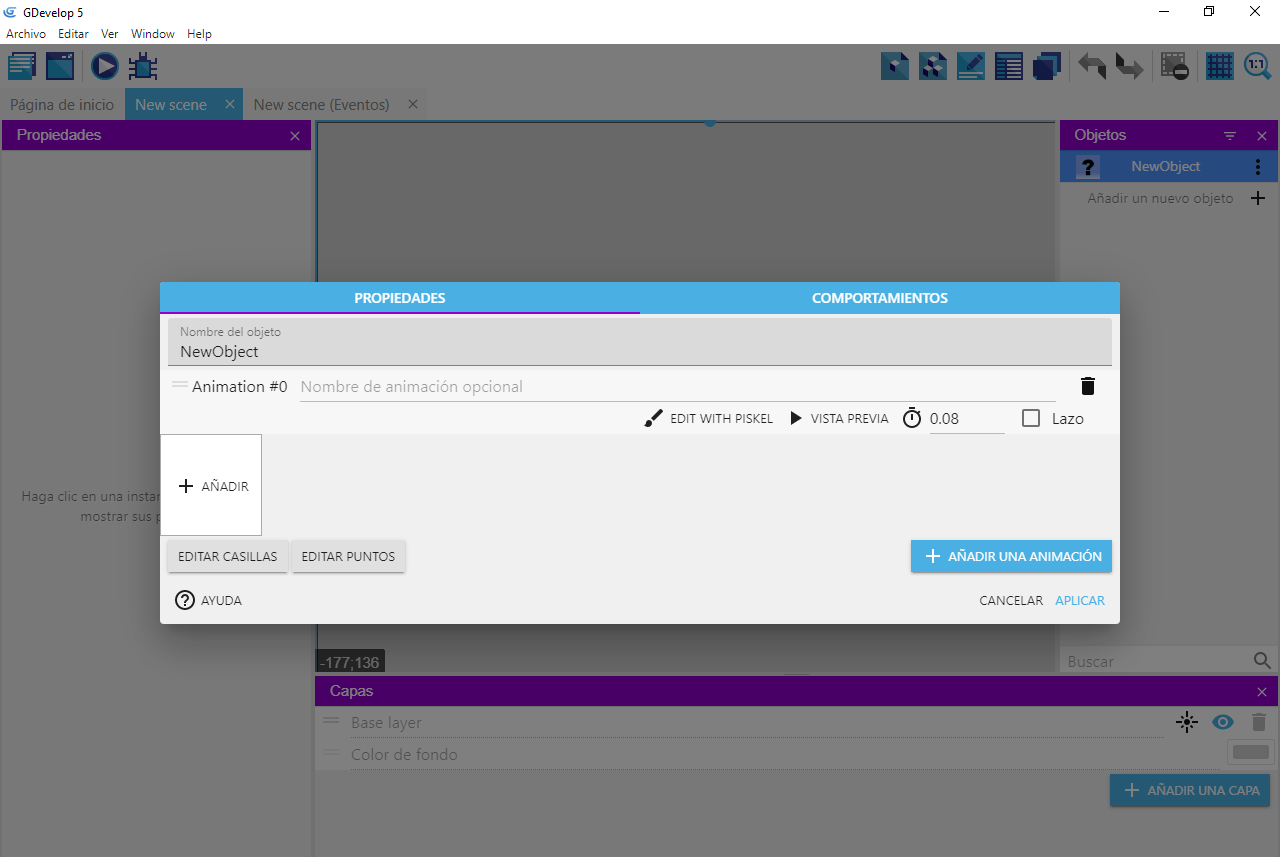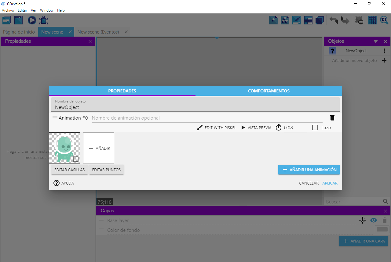 Por ahora, el objeto no tiene animaciones, las añadiremos más tarde.