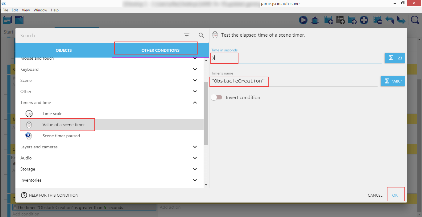 Activez Timers and time (Temps et chronomètre), sélectionnez Value of a scene timer (Valeur d'un chronomètre de scène). Dans le panneau de droite, entrez 5 pour Time in seconds (Durée en secondes) et "ObstacleCreation" pour Timer's name .