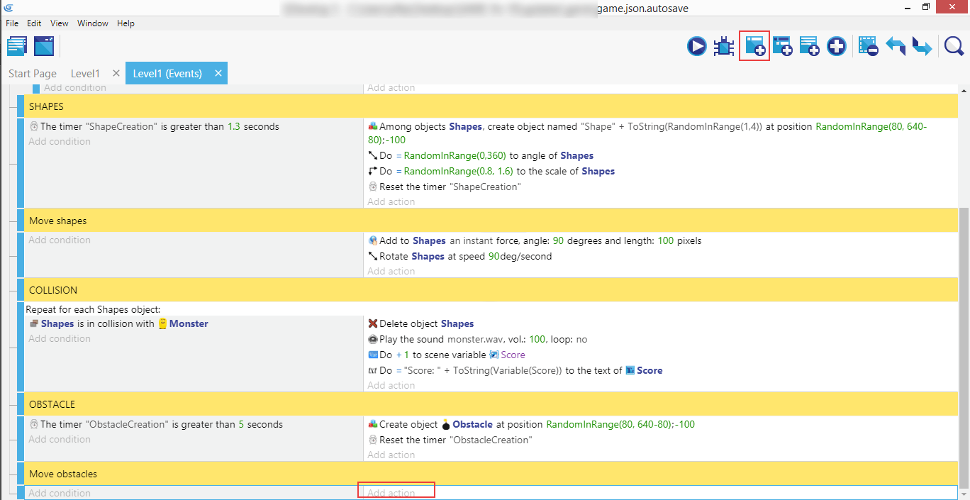 Le panneau des événements devrait ressembler la figure ci-dessous après avoir terminé avec succès les différentes étapes. Si c'est le cas, ajoutez un commentaire intitulé Move obstacles (déplacement des obstacles) puis un autre événement vide dans lequel vous créez une nouvelle action (Add action).