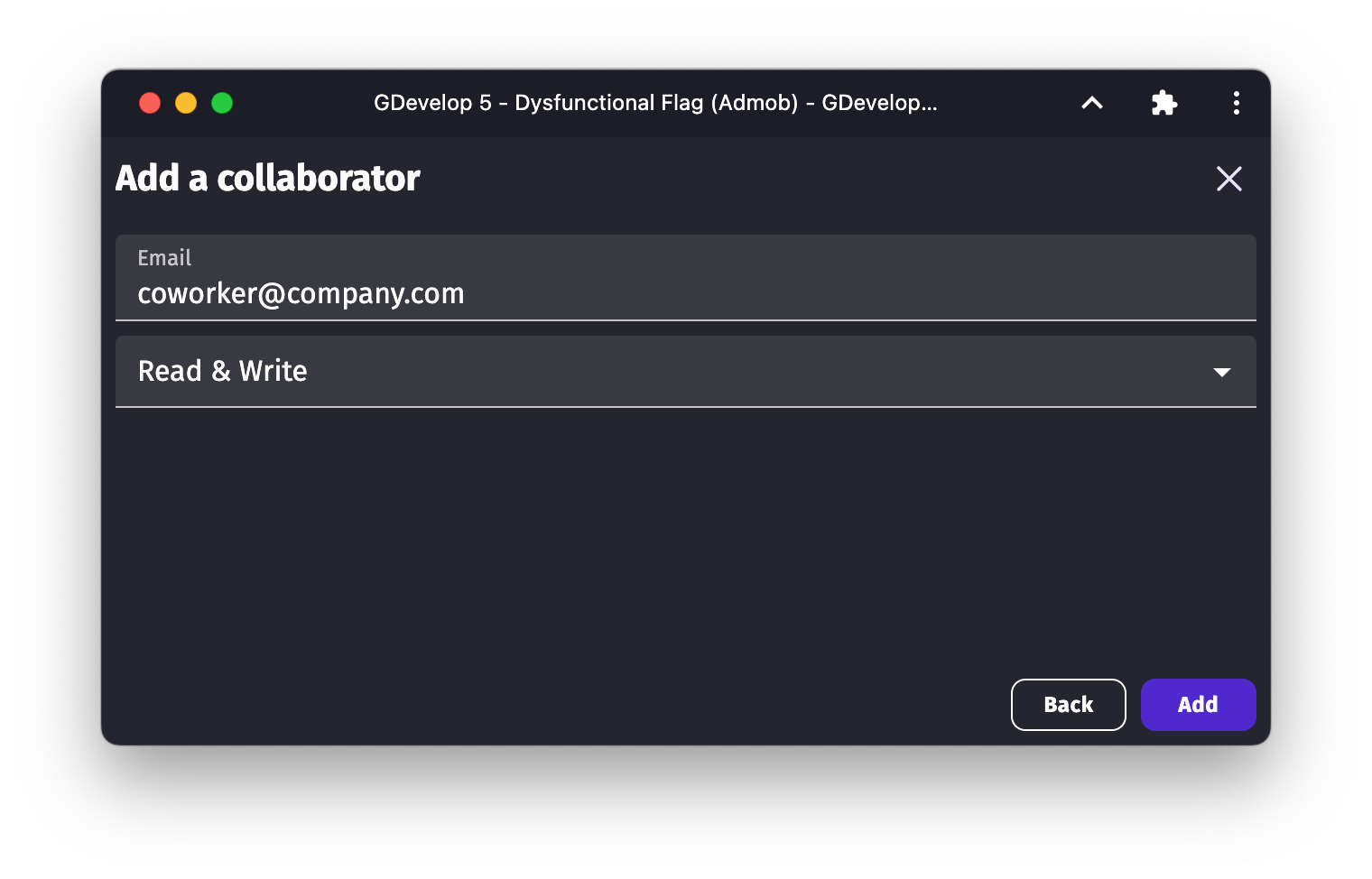 GDevelop allows you to share your project with other users, for example teammates or co-workers. This allows these users to open and modify the project when you're not editing it. Note that real-time collaboration is not yet ready and will be added in the future.