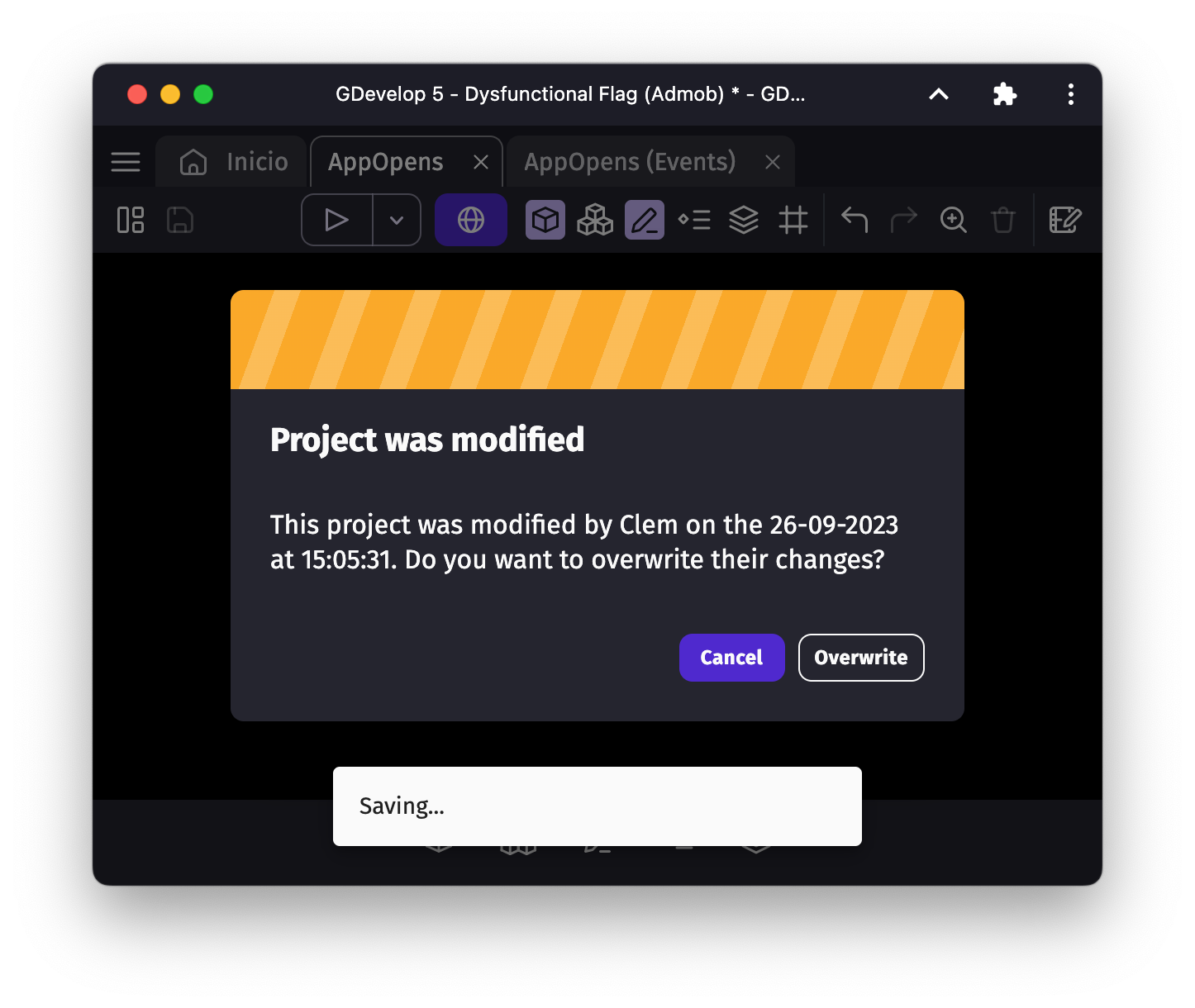 GDevelop will never prevent you from opening a shared project, even if someone else is already editing it. To prevent losing any work, GDevelop will warn you if you try to save a project that has been modified by someone else since you opened it.