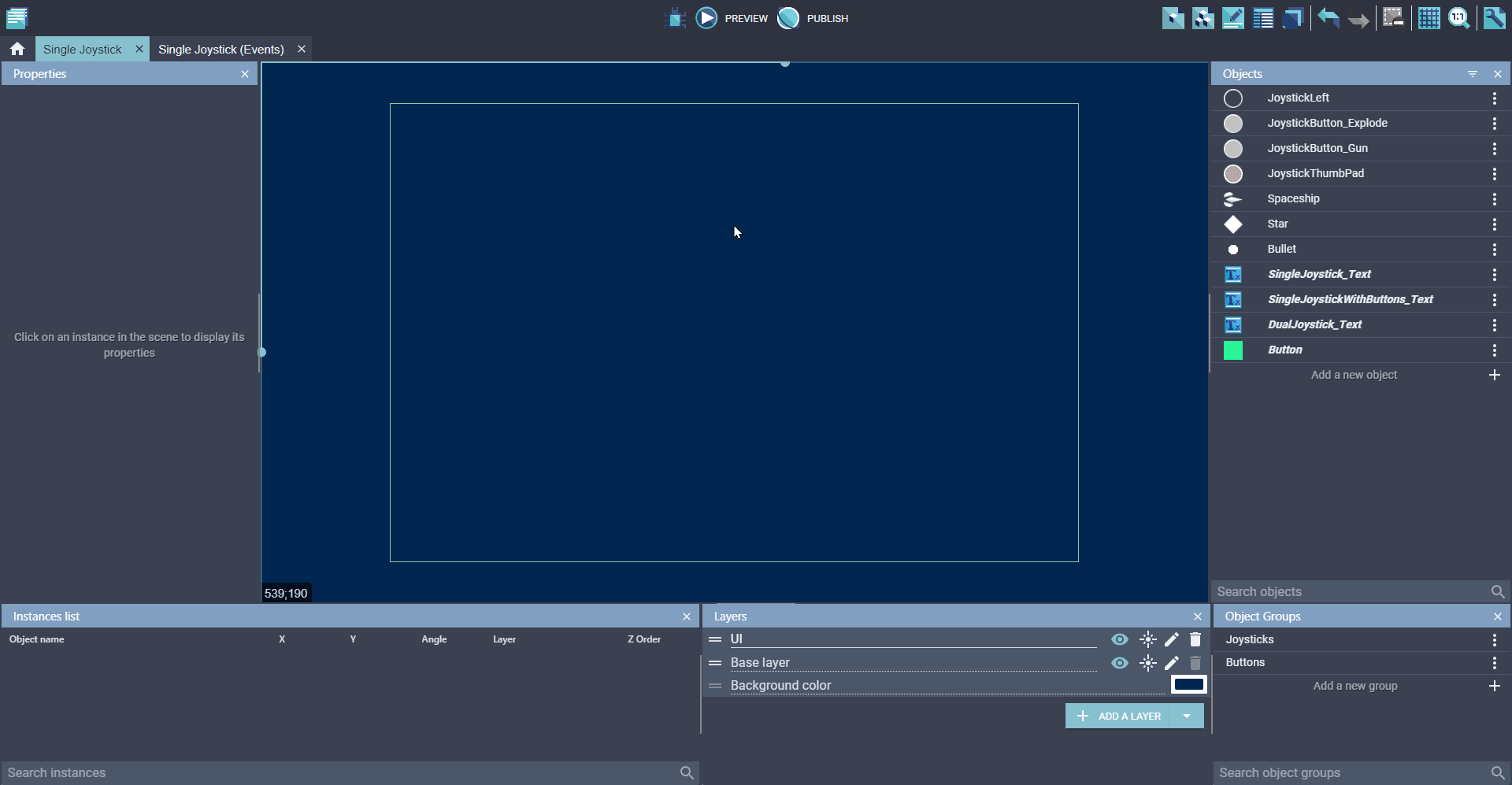 • Double-click on your "Joystick" object - Click on "Behaviors" tab - Click "Add a behavior" - Search for "joystick" and select "Multitouch Joystick" - Select "Floating" if you want the player to be able to move the joystick position - Click "Apply"