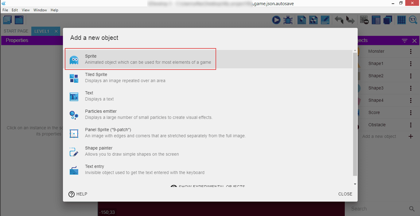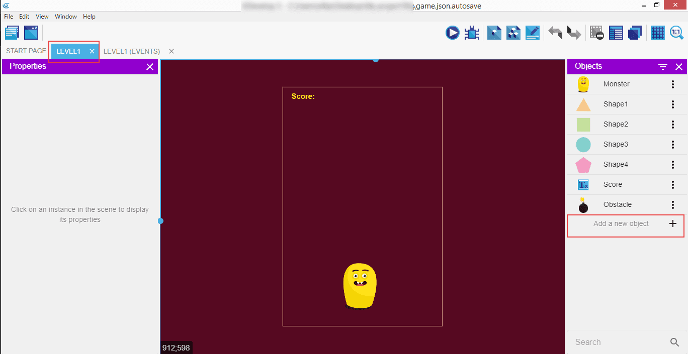 Click on the "Level1" to go back to the scene editor, then in the right panel with the "Objects" double click on the "Monster" - it will open a popup.