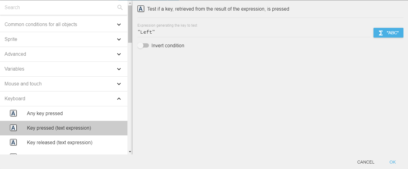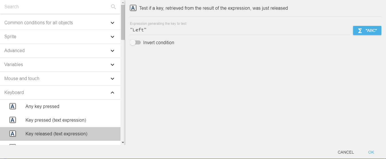 GDevelop はすべてのキーボード入力に対応しています。特定のキーを押しているか放したかを調べる条件も利用できます。