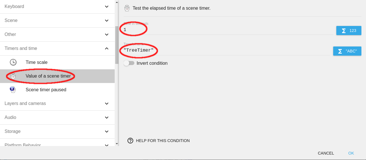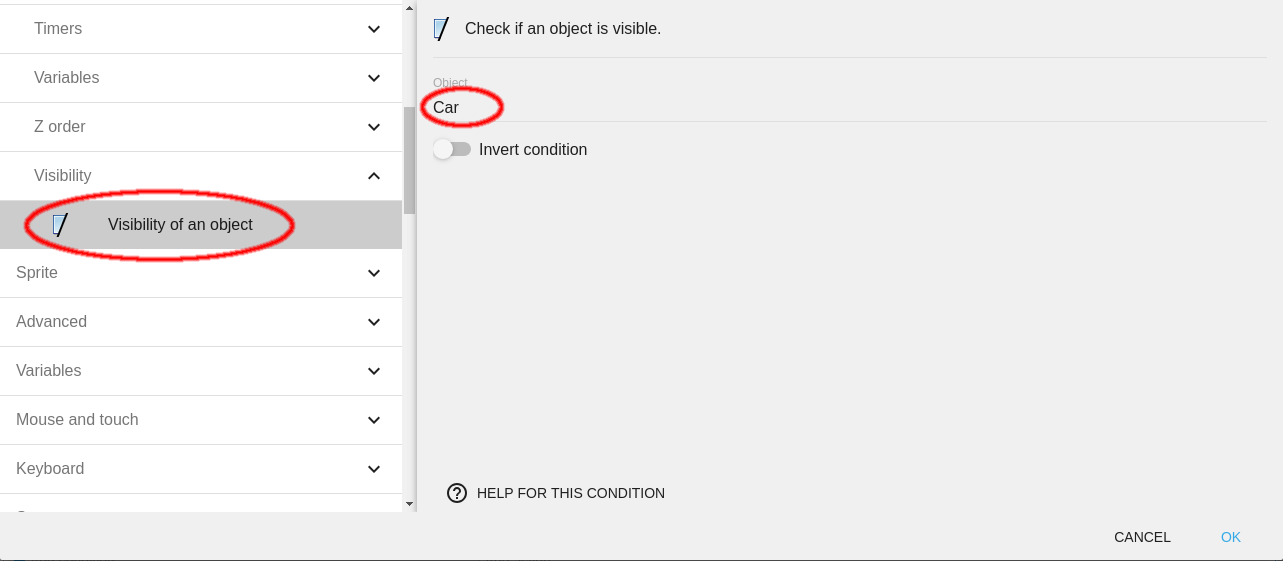 In the condition of the sub-event, we will check if the value of CarLeft is equal to 1. To do this, we will add the Value of a scene variable condition. Enter the variable name CarLeft in the Variable field, set the Sign of the test to = (equal to) and fill '1' in the Value to compare field.
