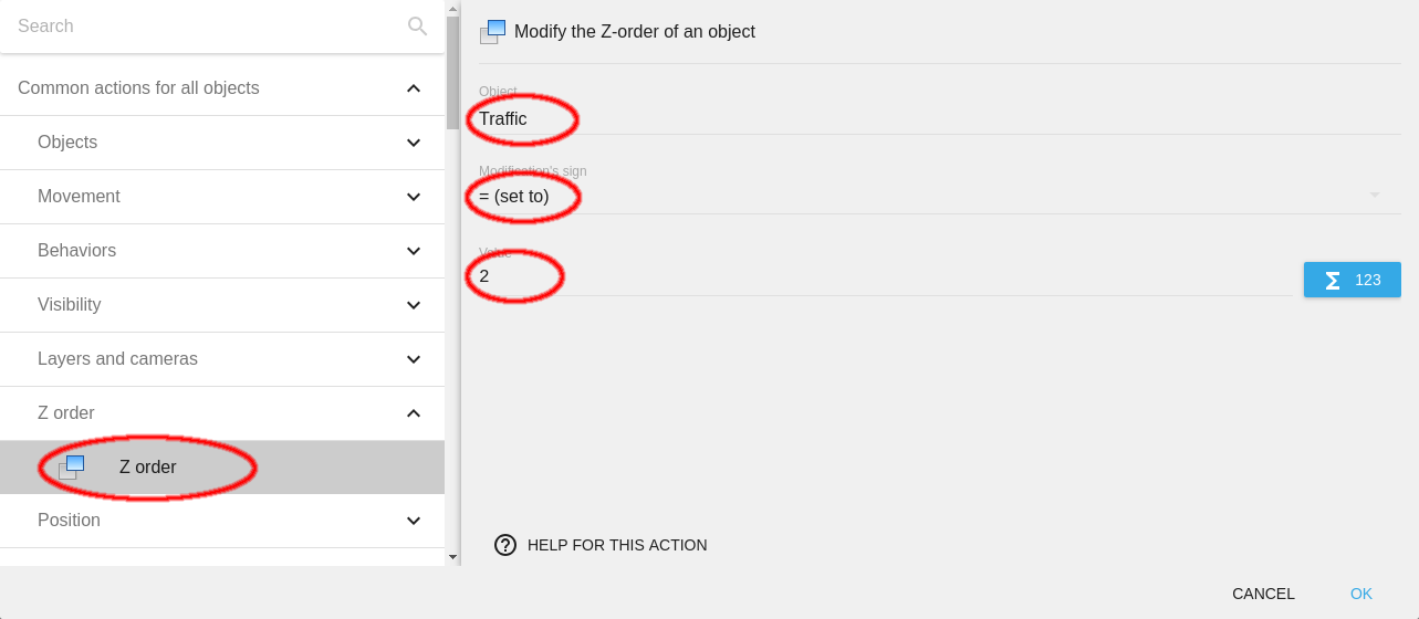 On starting a preview of the project, you might not be able to see the traffic cars yet. You can solve this problem by setting a Z order for the objects in the same event. To use the action for all the objects at once, create a new object group Traffic. Add all the objects to the group.