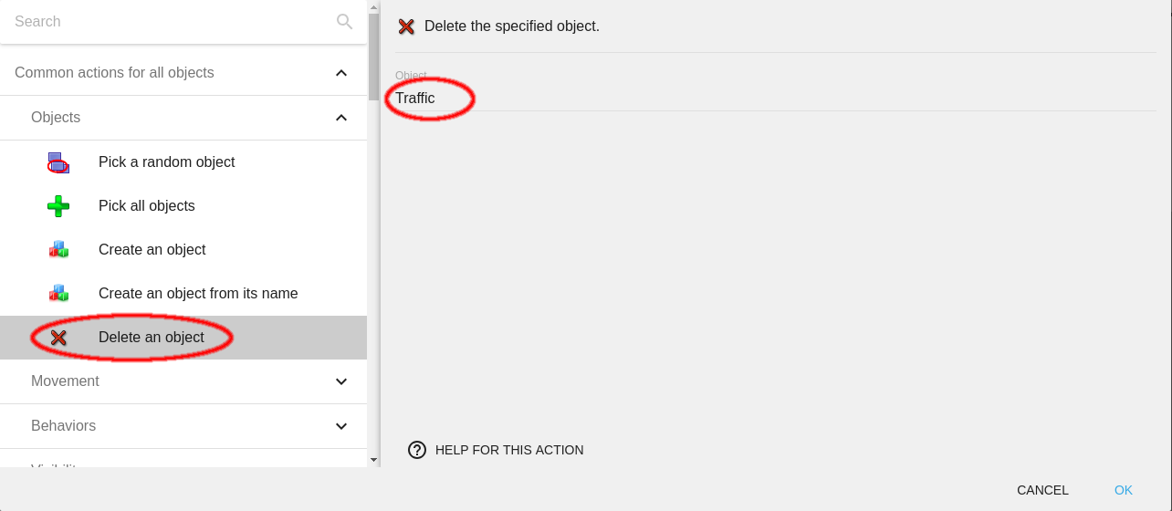 To solve this problem as well as to optimise the game by freeing up memory, we will add another action to the event which will delete the object Traffic.