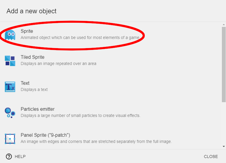 続いて「新しいオブジェクト」ダイアログウインドウがポップアップするので、「スプライト」を選択します。