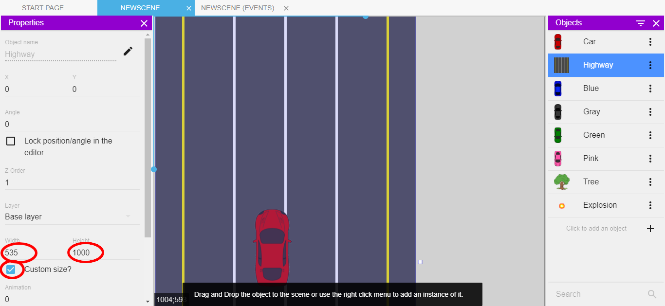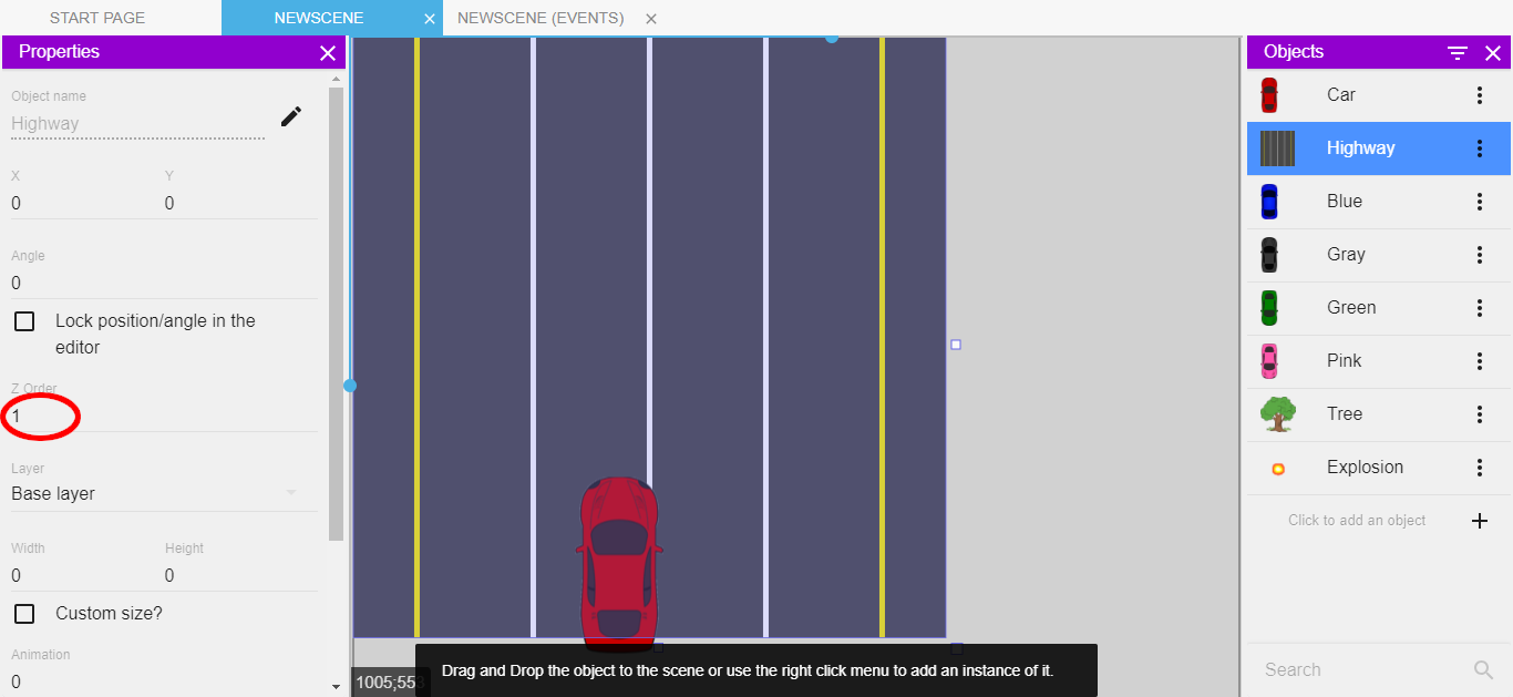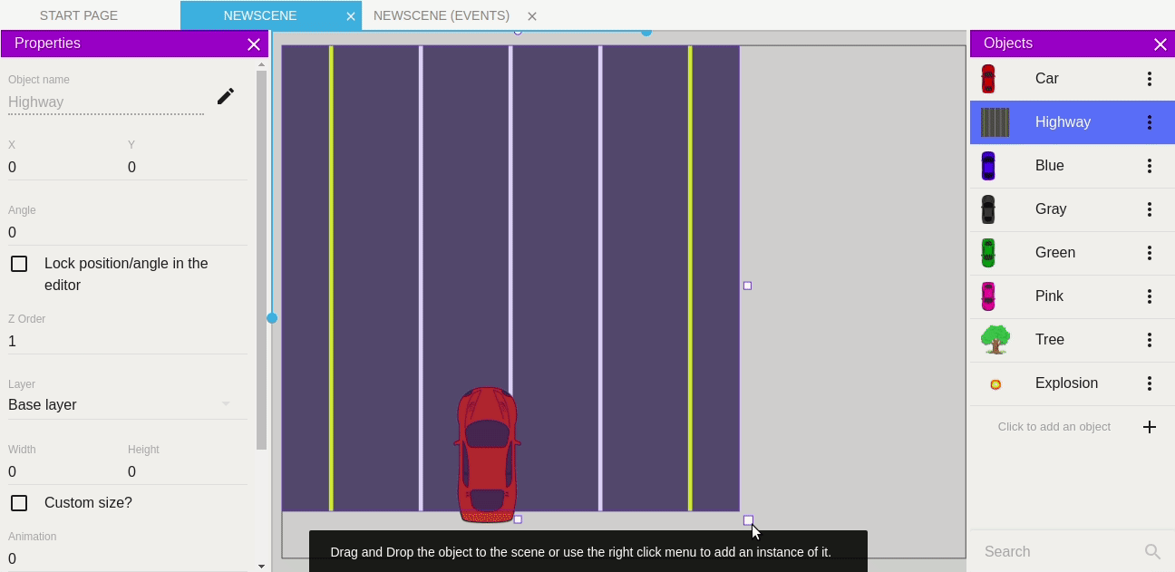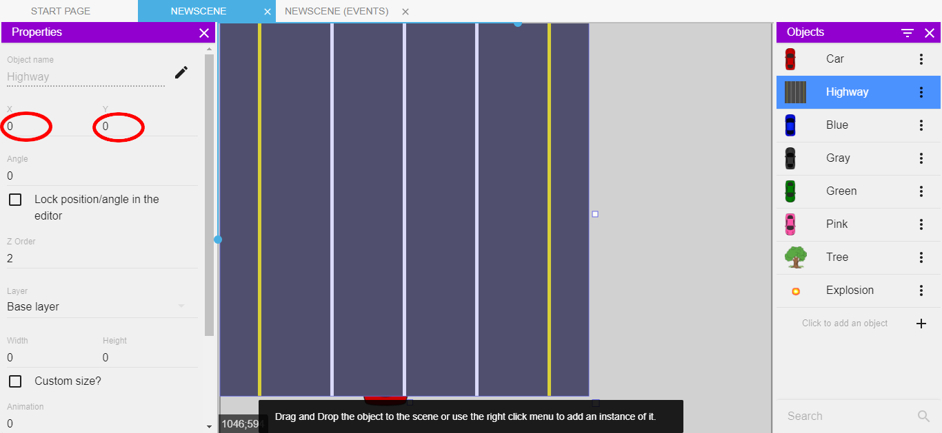 Similarly, to create an instance of Highway you can drag and drop the object to the scene and set its X and Y-coordinates.