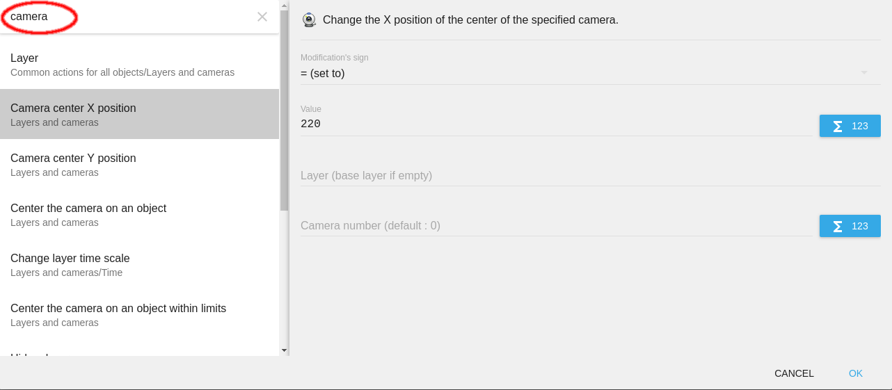 For example, to change the position of the camera, you can go to Layers and Cameras followed by Camera center X position. The right part of the window will now display configurable parameters.