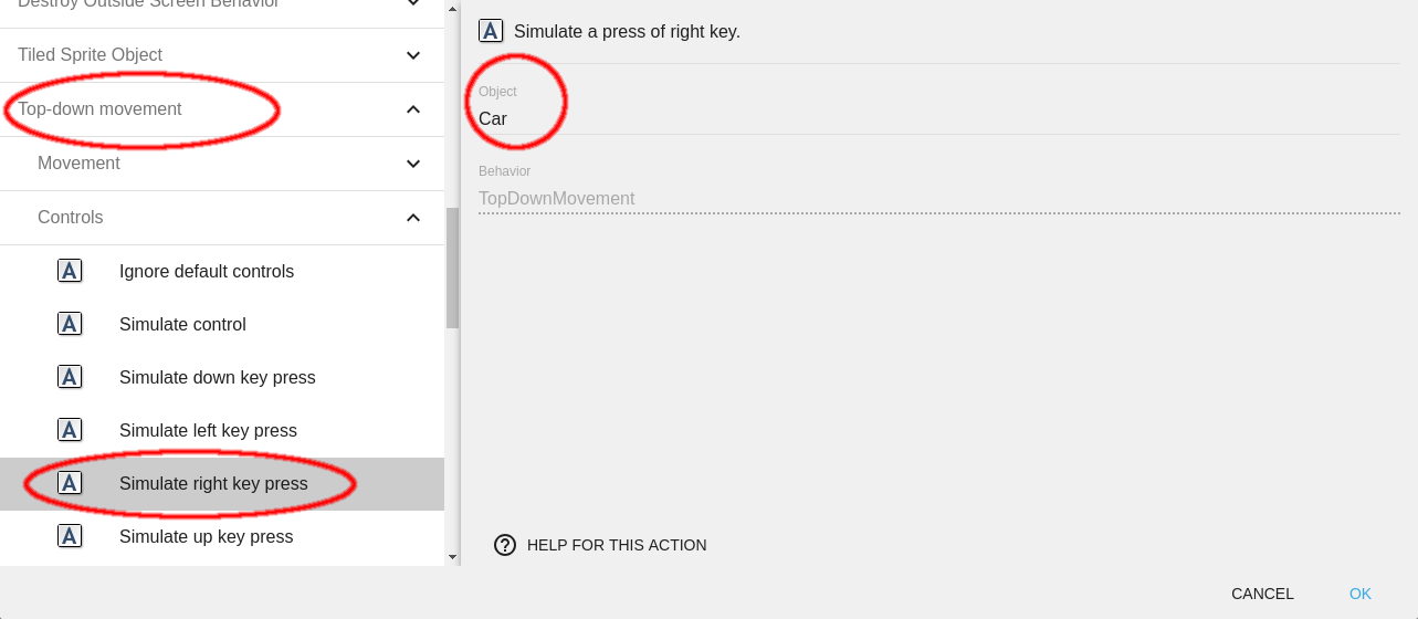 For the action, when the left key is pressed, the Car should have a movement on the left side. This can be easily done using an action Simulate left key press that would simulate the left side movement for the object selected (Car).