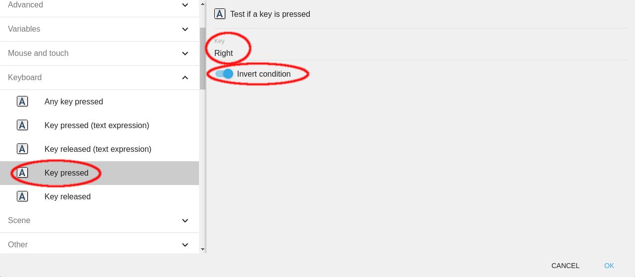 To achieve this, we add a new event and try to add the above 2 conditions, i.e. right key press inverted and left key press inverted. We add a condition Left key is pressed and turn on the switch below that says Invert conditions.
