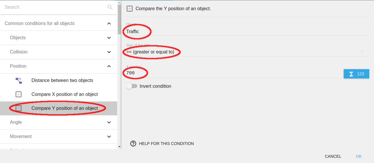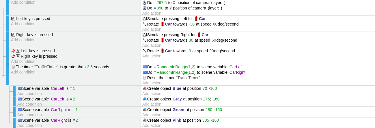 To display the score, we will make an event such that when any object in the group Traffic passes a predefined position, the value of the score is updated. To do this, we need to use the help of a scene variable.