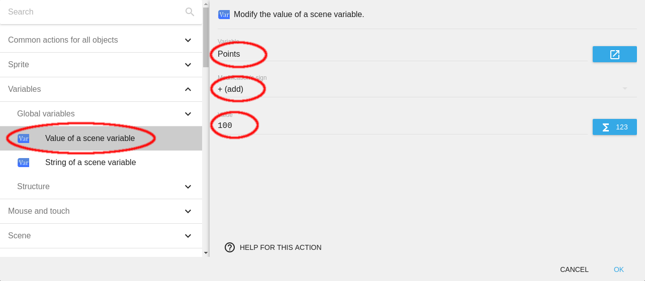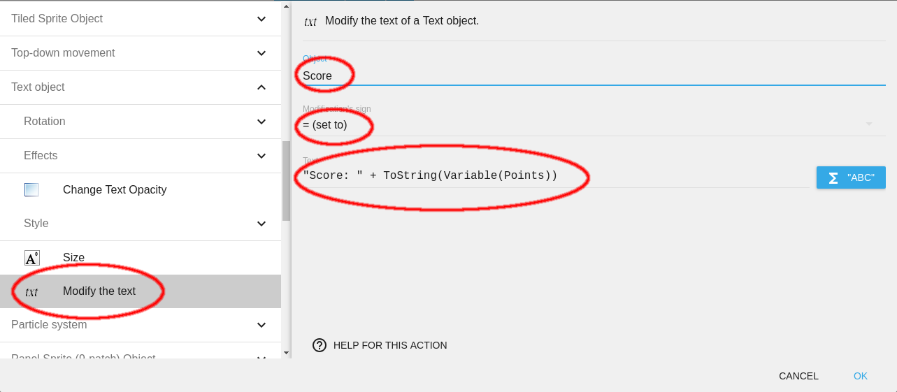 We will use the action Modify the text. Enter Score in the Object field and set the Modification's sign to = (set to).