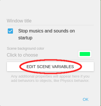 The gray background does not really suit the game. As there will be trees on both sides of the road, the green color might be the best. To do so, you can right-click anywhere on the scene and select Scene properties. Click on the box below Scene background color that says Click to choose.