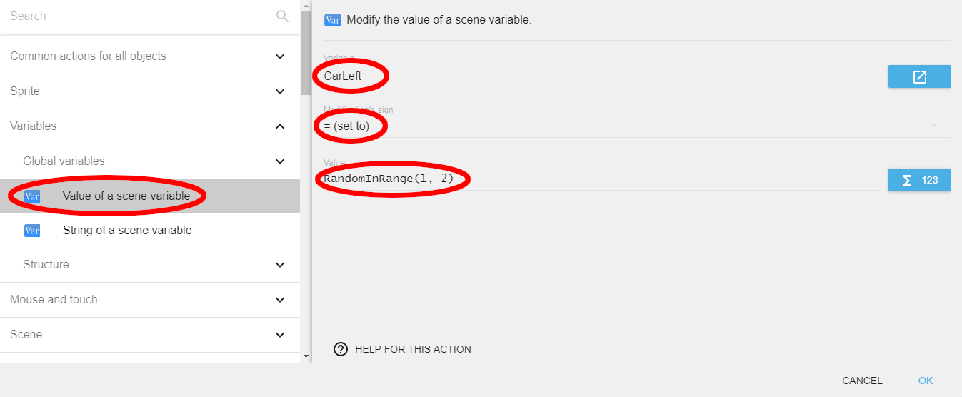 Our action will be to create and change the value of a scene variable. Create a new scene variable Points similar to how we created variables CarLeft and CarRight.