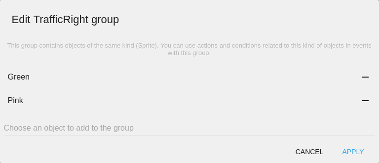 Click on the Choose an object to add to the group field and choose the object Blue followed by Gray and click APPLY. This object group represents the cars on the left side of the highway.